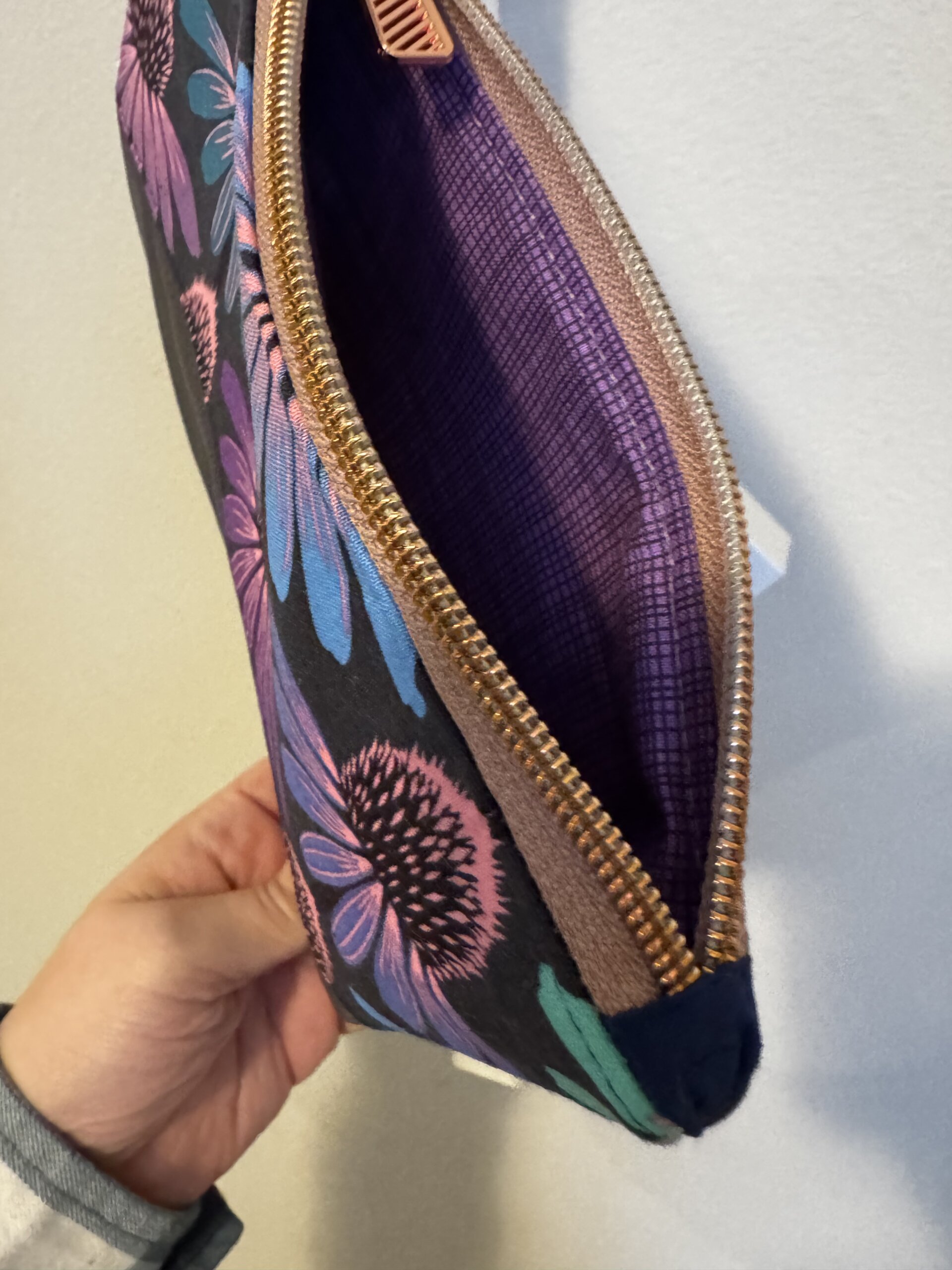 Add a bold pop of color to your daily routine! This stunning wristlet features a vibrant, eye-catching coneflower print perfectly paired with a sleek, dark gray upcycled genuine leather base. It is the ideal grab-and-go size for keeping your essentials secure, whether you are running errands or heading out for the evening. It comes complete with a smooth zipper, a removable wrist strap for hands-free convenience, and a gorgeous contrasting purple lining inside.