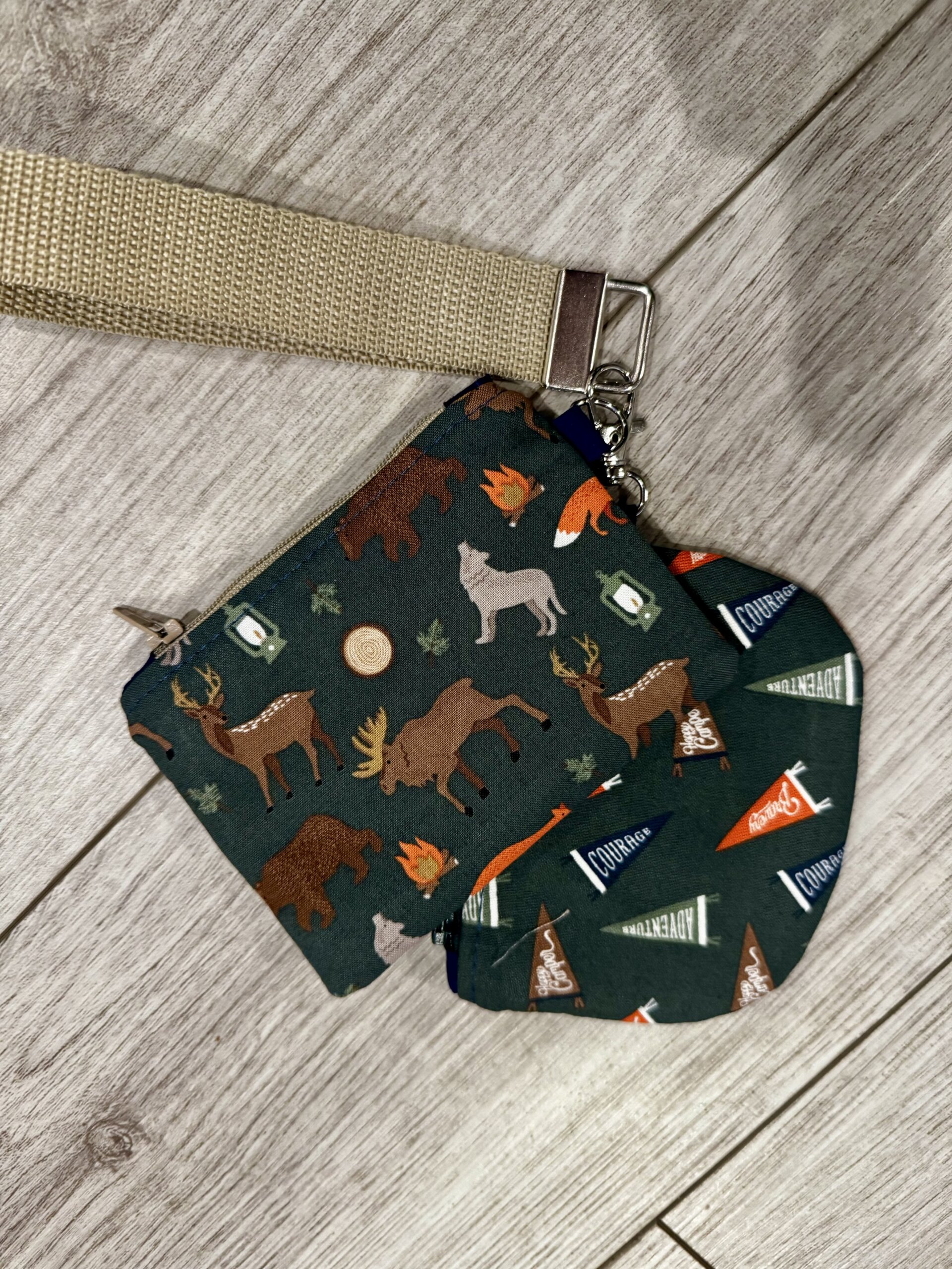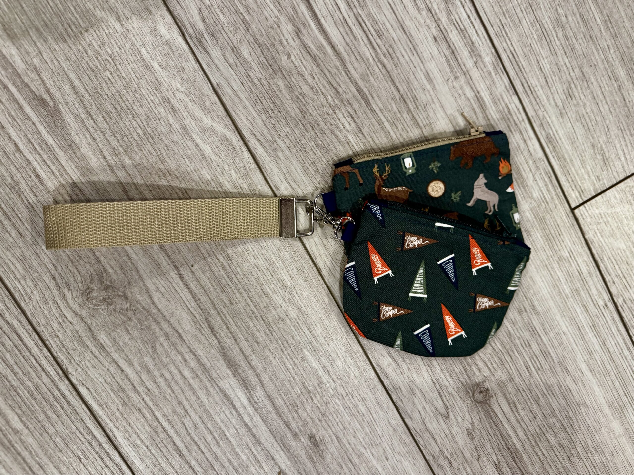 The pouch features a rich forest green fabric filled with charming woodland animals—deer, moose, bears, wolves, and foxes—alongside cozy campfires and adventure flags. It’s paired with a coordinating fabric and finished with a sturdy wristlet strap so you can carry it easily on the go.