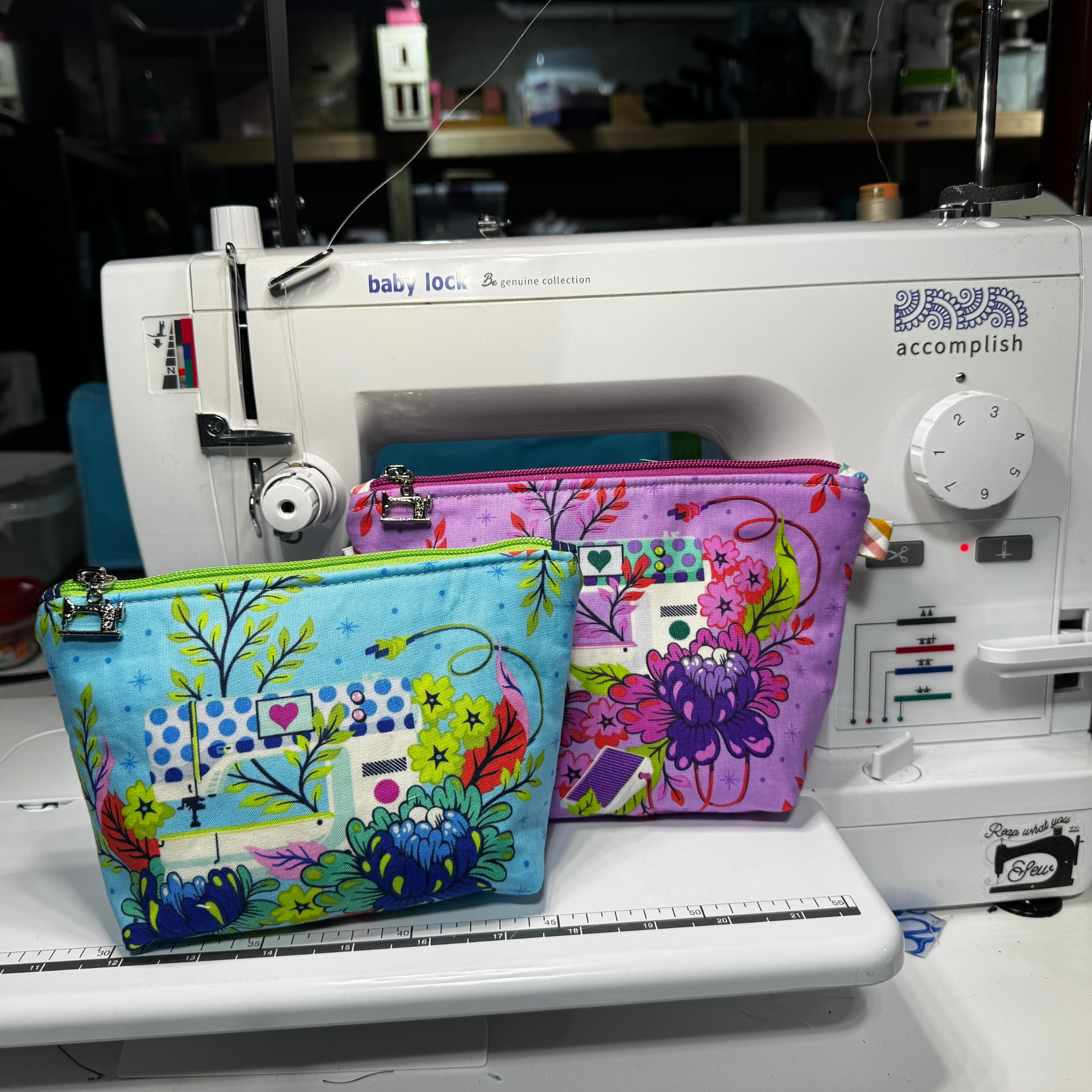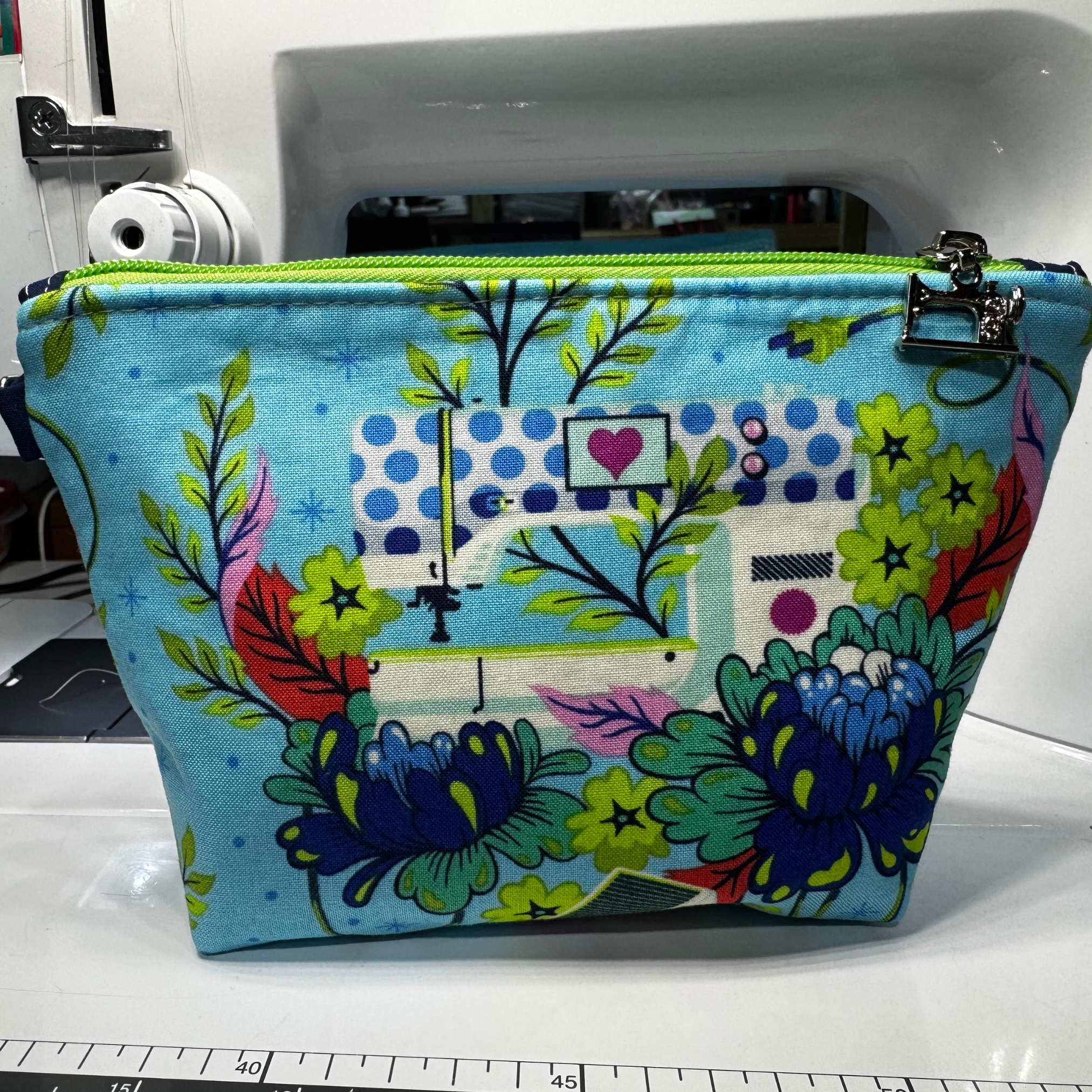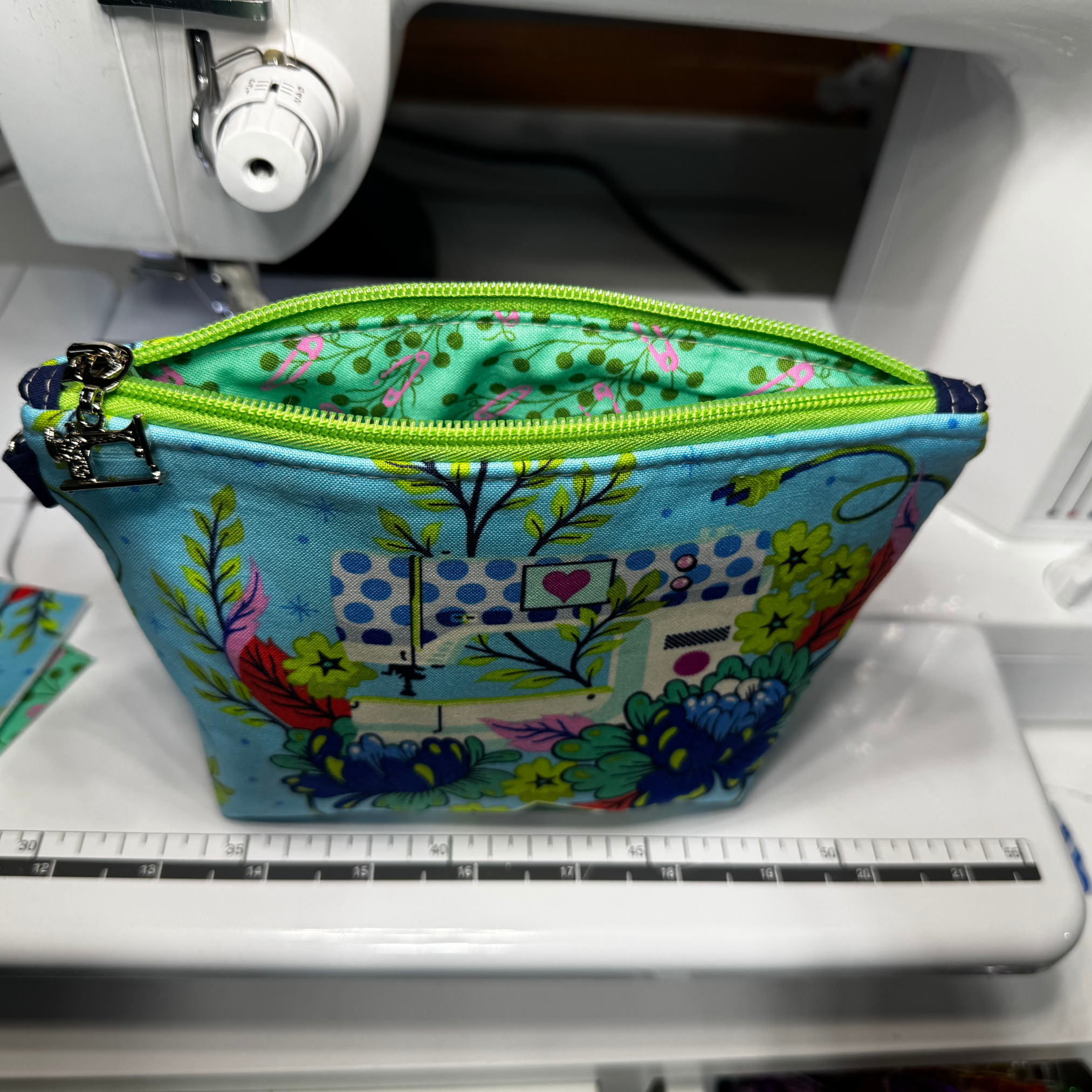 The stunning light blue exterior showcases a whimsical sewing machine surrounded by vibrant, blooming florals. Unzip the bright, contrasting lime green zipper with the adorable custom silver sewing machine pull to reveal a truly maker-inspired surprise: a gorgeous green interior lining covered in delicate vines and playful pink safety pins!
