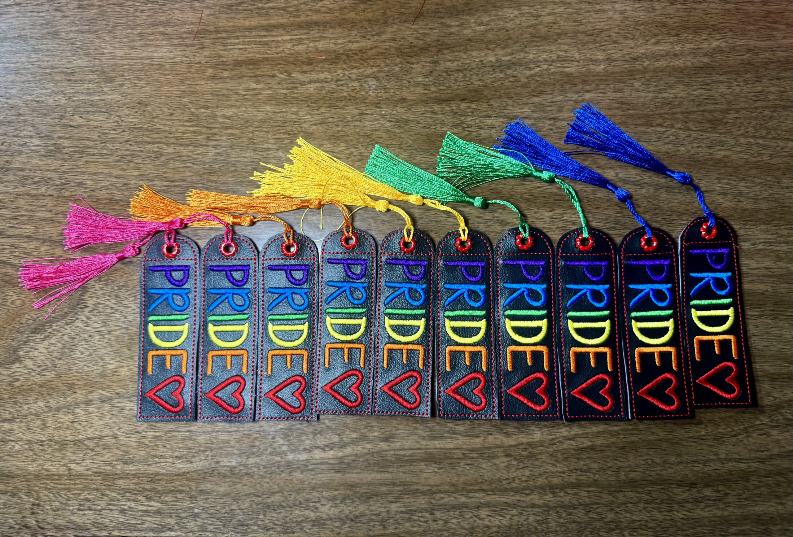Celebrate love and your current read with our vibrant PRIDE bookmarks! Perfect for keeping your place in your favorite novel, planner, or notebook, these bookmarks are stitched on a durable, dark faux-leather backing that makes the bright rainbow thread truly stand out. Each bookmark features the word “PRIDE” and a heart embroidered in a beautiful rainbow gradient. Finished with a coordinating, silky tassel and a sturdy metal eyelet, this is a beautiful and functional accessory for any book lover.
