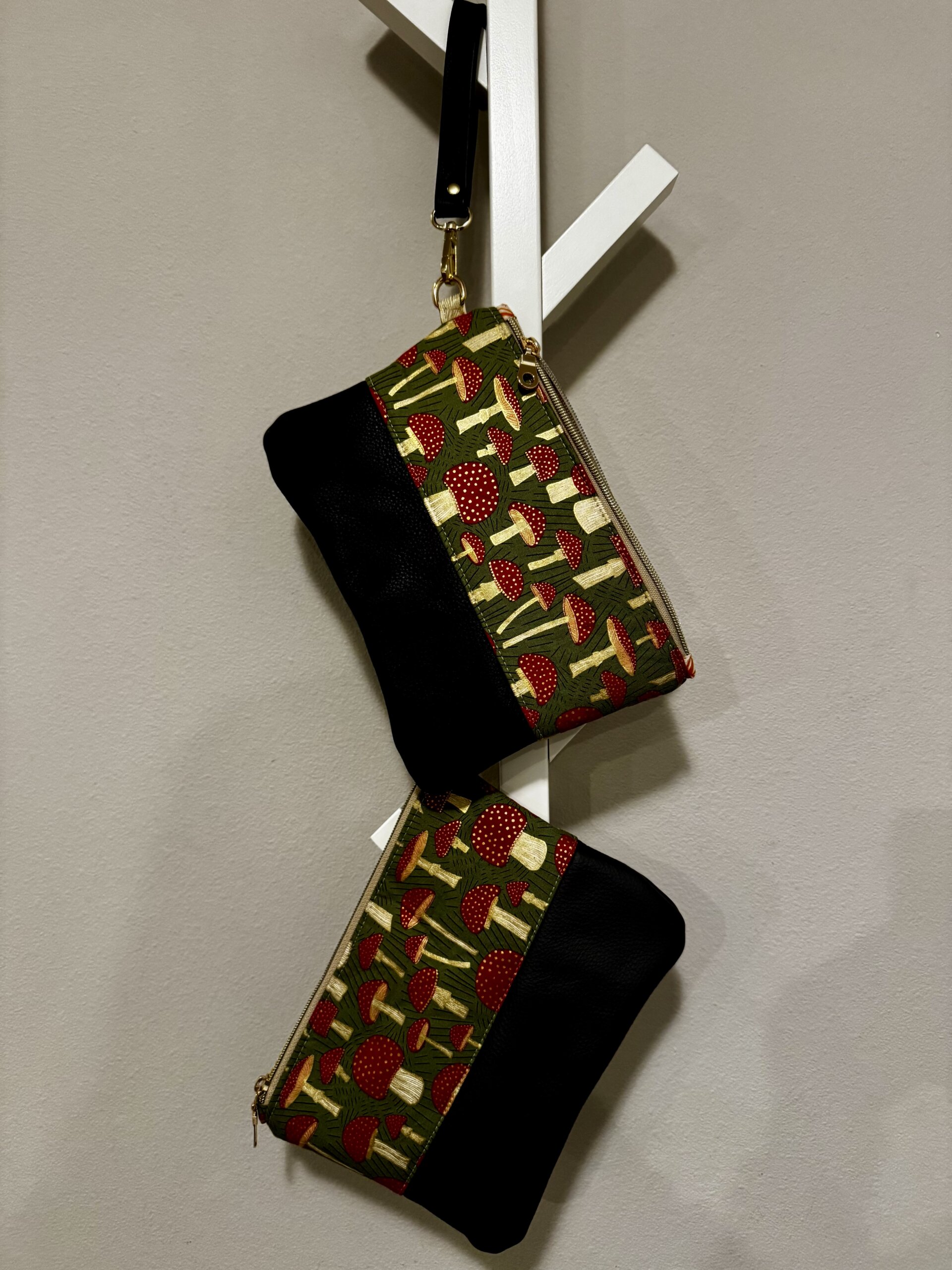 The exterior features a whimsical green, red, and gold mushroom print, perfectly contrasted by a sleek and durable base crafted from upcycled real leather upholstery scraps. Unzip the smooth gold-tone hardware to reveal a delightful surprise: a bright, geometric orange lining that makes finding your keys, cards, and phone a breeze.