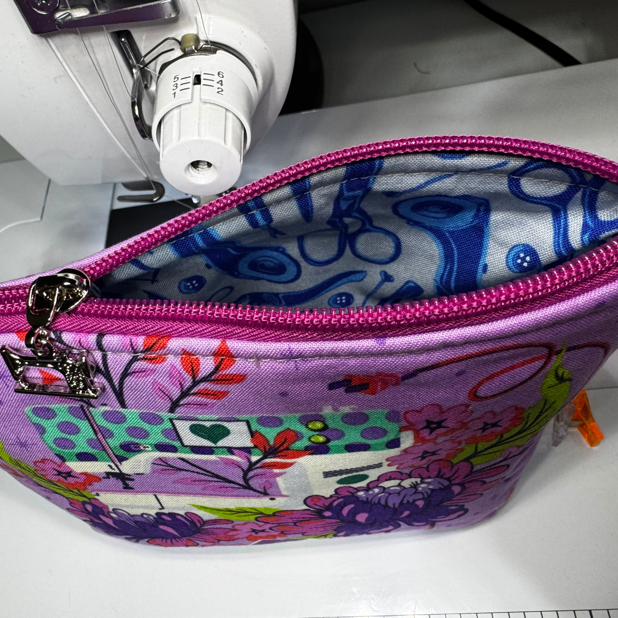 The gorgeous purple exterior features a beautifully detailed sewing machine framed by lush, colorful florals. But the maker-magic doesn’t stop there! Slide open the matching magenta zipper using the adorable, custom silver sewing machine pull to reveal a perfectly coordinated interior lining packed with illustrated sewing notions like scissors, thread spools, and buttons.