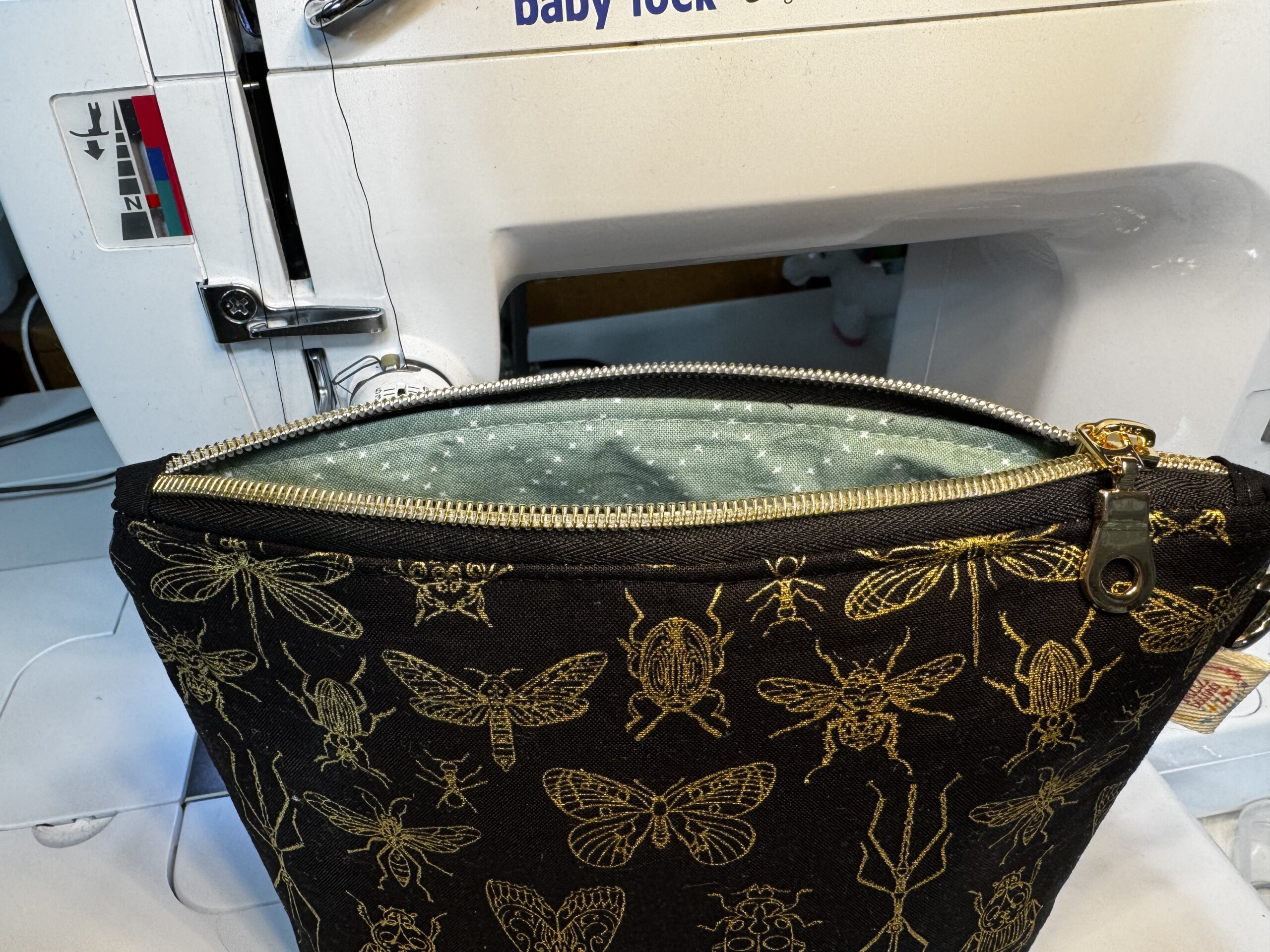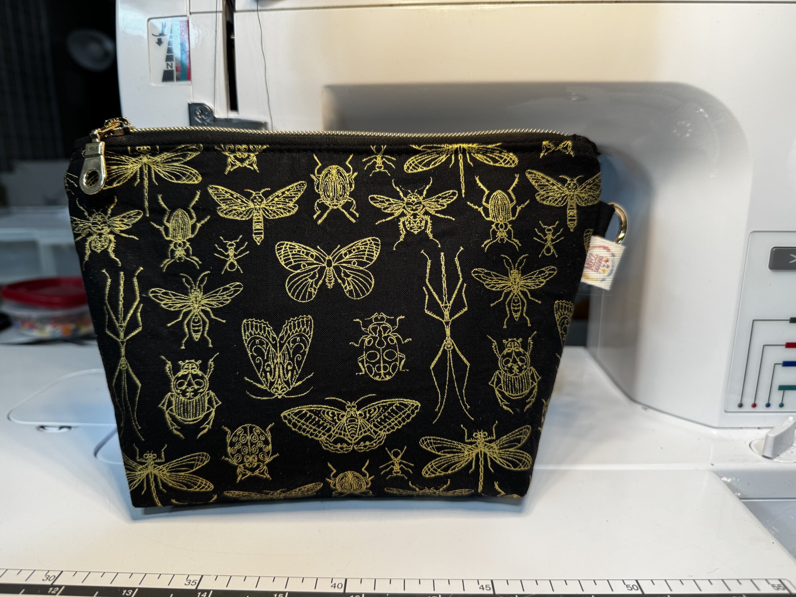 Perfect for nature lovers and anyone who appreciates a unique, edgy aesthetic! This handmade zipper pouch features an eye-catching array of metallic gold line-drawn insects—including butterflies, beetles, and dragonflies—set against a sleek black background.