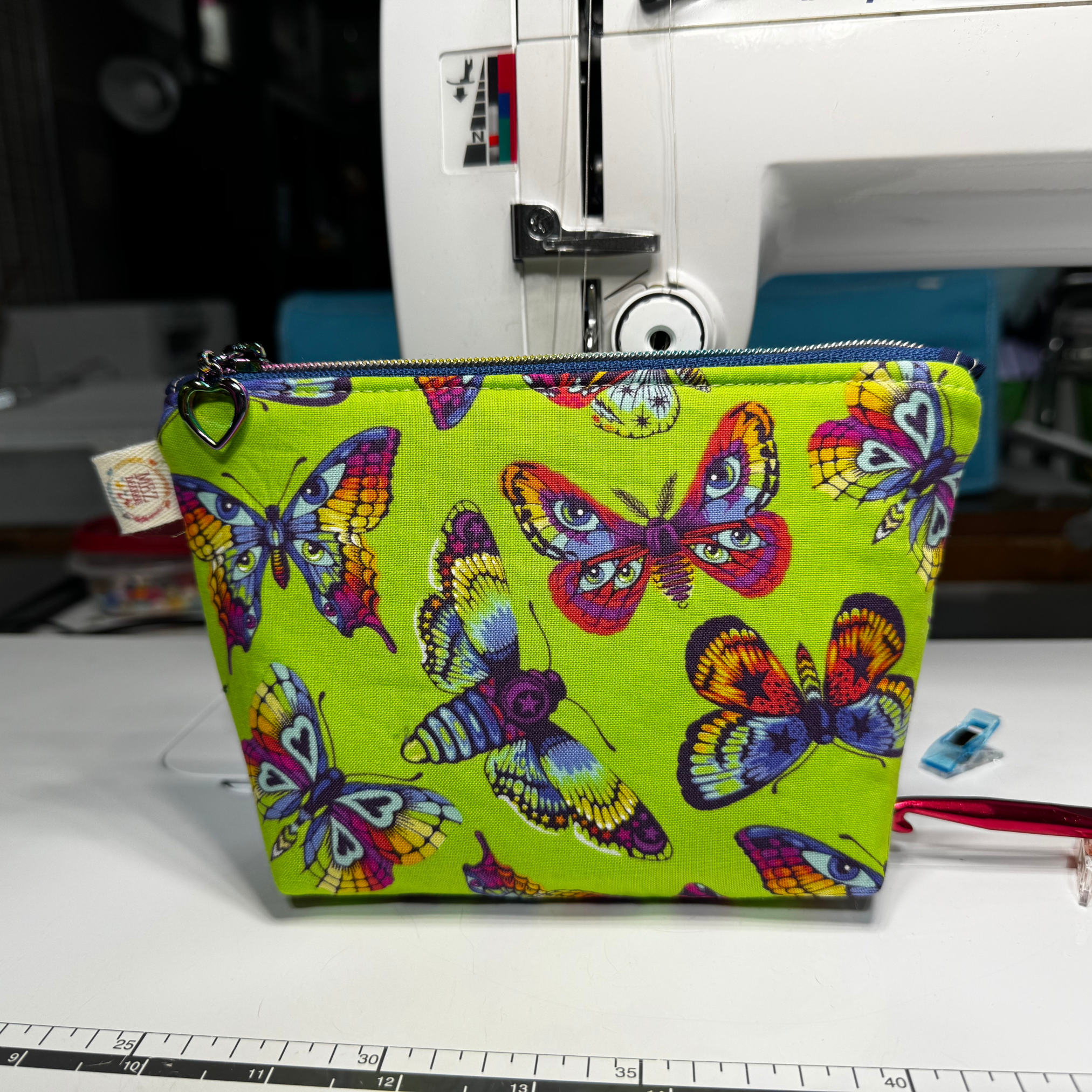 Bring a splash of vibrant, kaleidoscopic color to your day with this stunning handmade zipper pouch! Crafted from Tula Pink’s whimsical “Daydream” collection, this bag features a bright, apple-green background covered in intricately detailed, multicolored butterflies and moths.
