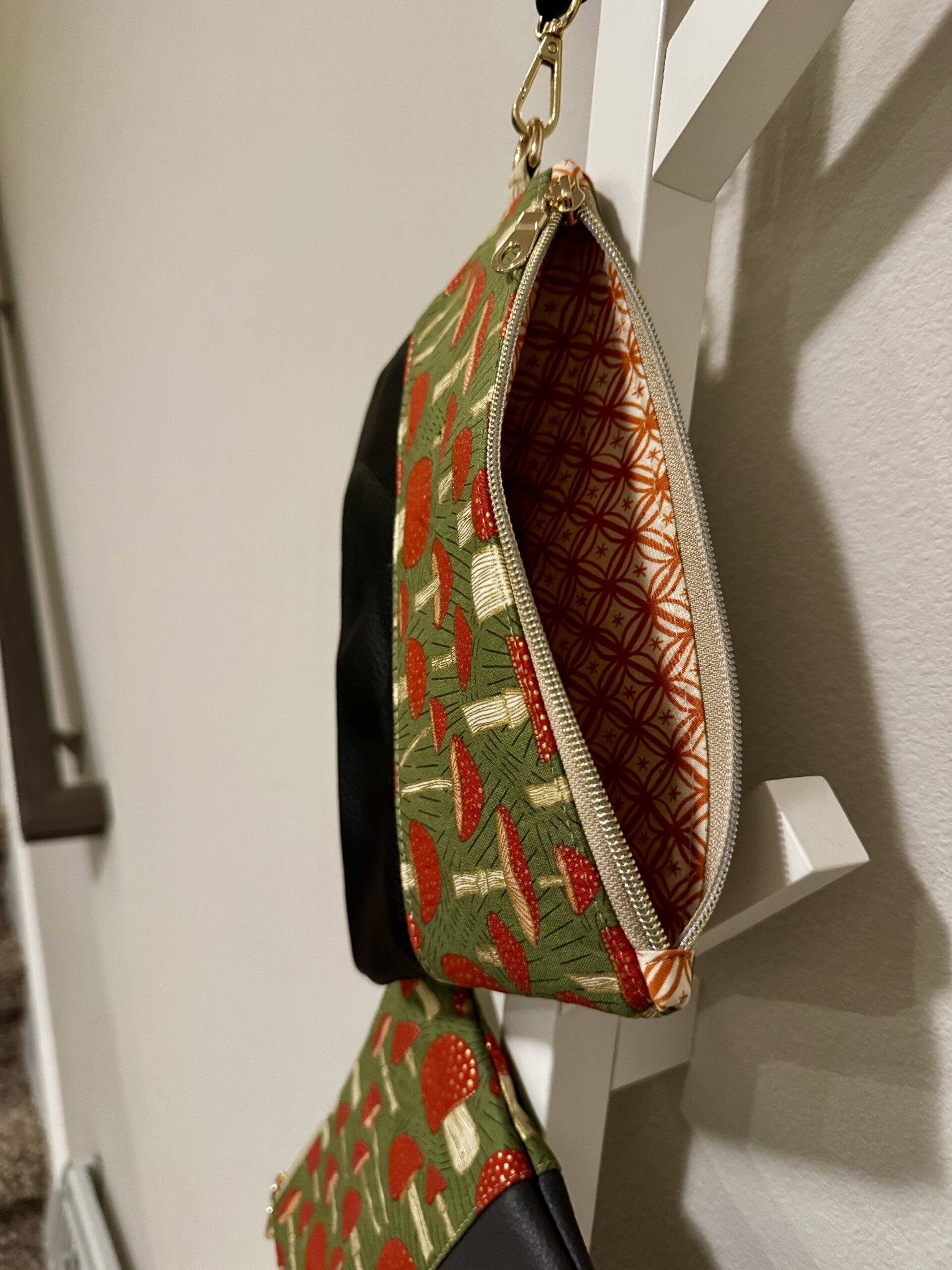 The exterior features a whimsical green, red, and gold mushroom print, perfectly contrasted by a sleek and durable base crafted from upcycled real leather upholstery scraps. Unzip the smooth gold-tone hardware to reveal a delightful surprise: a bright, geometric orange lining that makes finding your keys, cards, and phone a breeze.