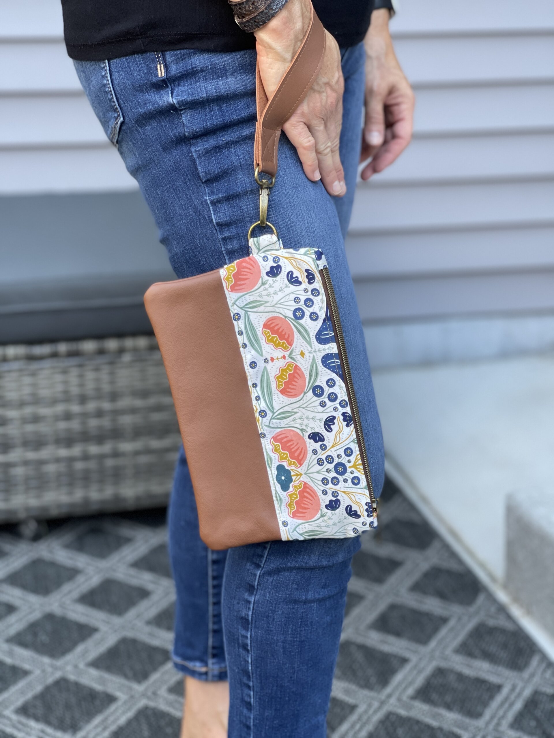 Wristlet – Scandinavian Peach Floral with Brown Upcycled Leather